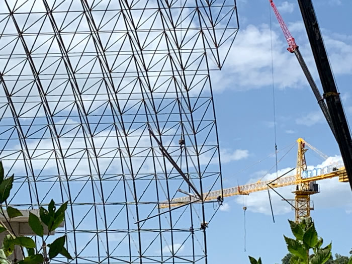 ?。?)本工程網(wǎng)架采用“山墻起步+錐體高空散裝法”進(jìn)行安裝,即先安裝1軸山墻網(wǎng)架(含相鄰跨網(wǎng)架)作為整個網(wǎng)架的起步網(wǎng)架,然后從起步網(wǎng)架開始依次往17軸方向?qū)W(wǎng)架進(jìn)行高空散裝,***后安裝17軸山墻網(wǎng)架,***終安裝完成整個網(wǎng)架。